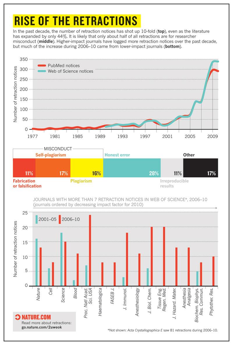 One of the problems with scientific research is the fact that retractions happen. They have been on the rise recently as well. There have been some high profile instances which have had some serious ramifications. one of these cases was in the prestigious Lancet from the UK and it involved a sample of 12 children and has caused the vaccine autism connection. In the graph below is a break down of the reasons for retractions. We need to be aware that mistakes do happen, but real fraud is completely unacceptable.